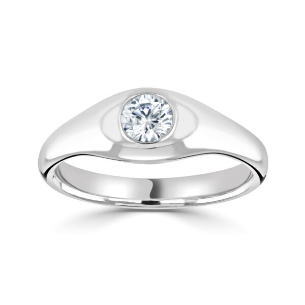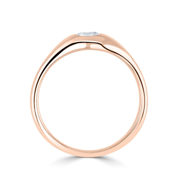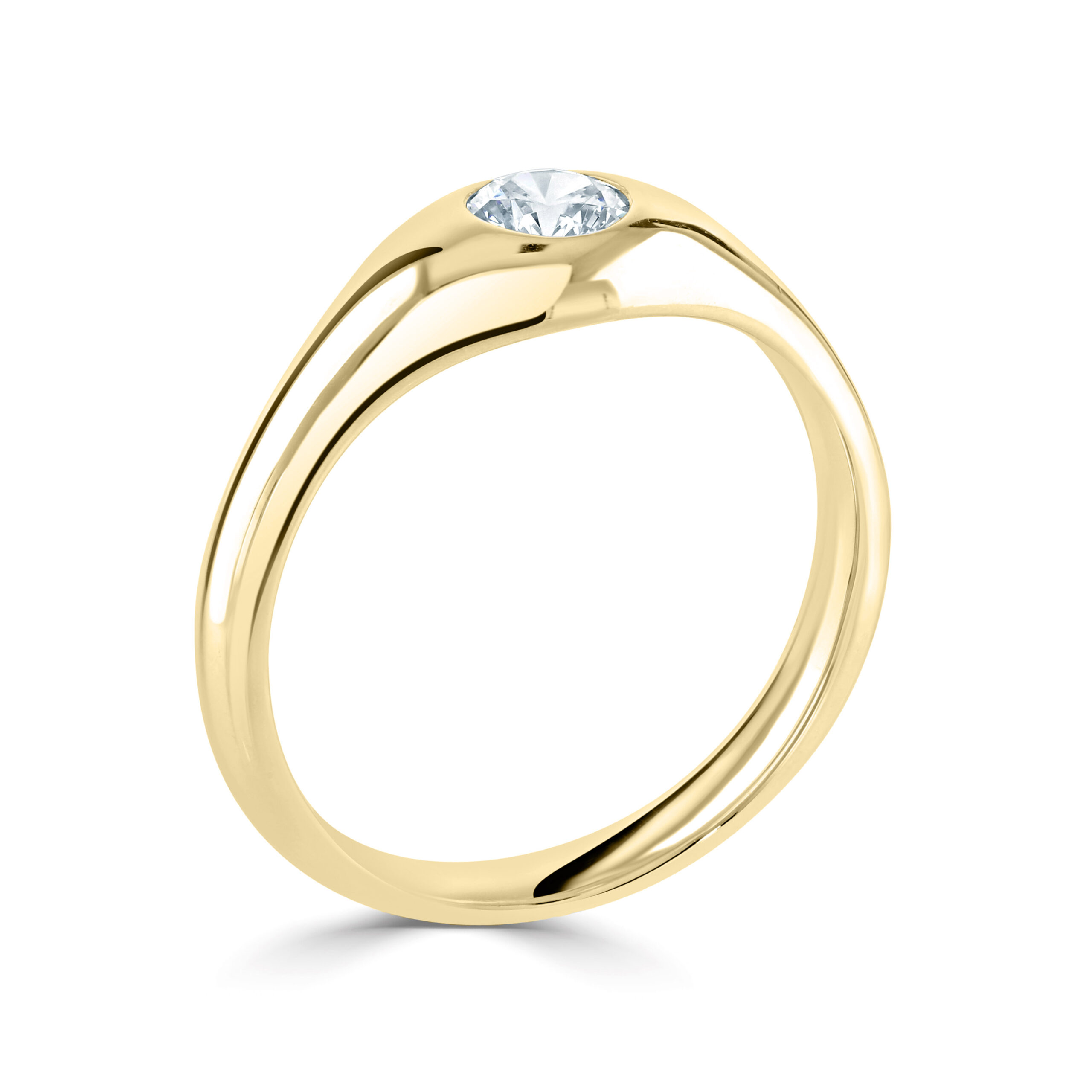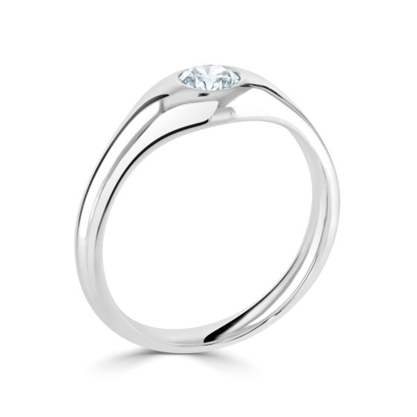 A classic flush set ‘gypsy’ ring with plain shoulders.